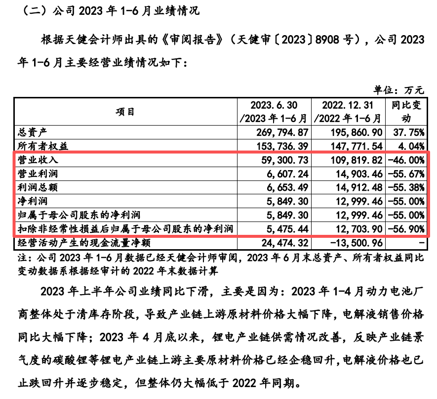 2023年1-6月,公司营业收入5.93亿元,同比下降46.00%;归母净利润5,849.30万元,同比下降55.00%;扣非归母净利润5,475.44万元,同比下降56.90%。