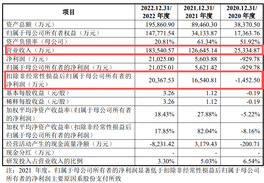 2020年至2022年,公司实现营业收入2.53亿元、12.66亿元及18.35亿元;实现扣非后归母净利润分别为-1,452.50万元、1.65亿元及2.04亿元。