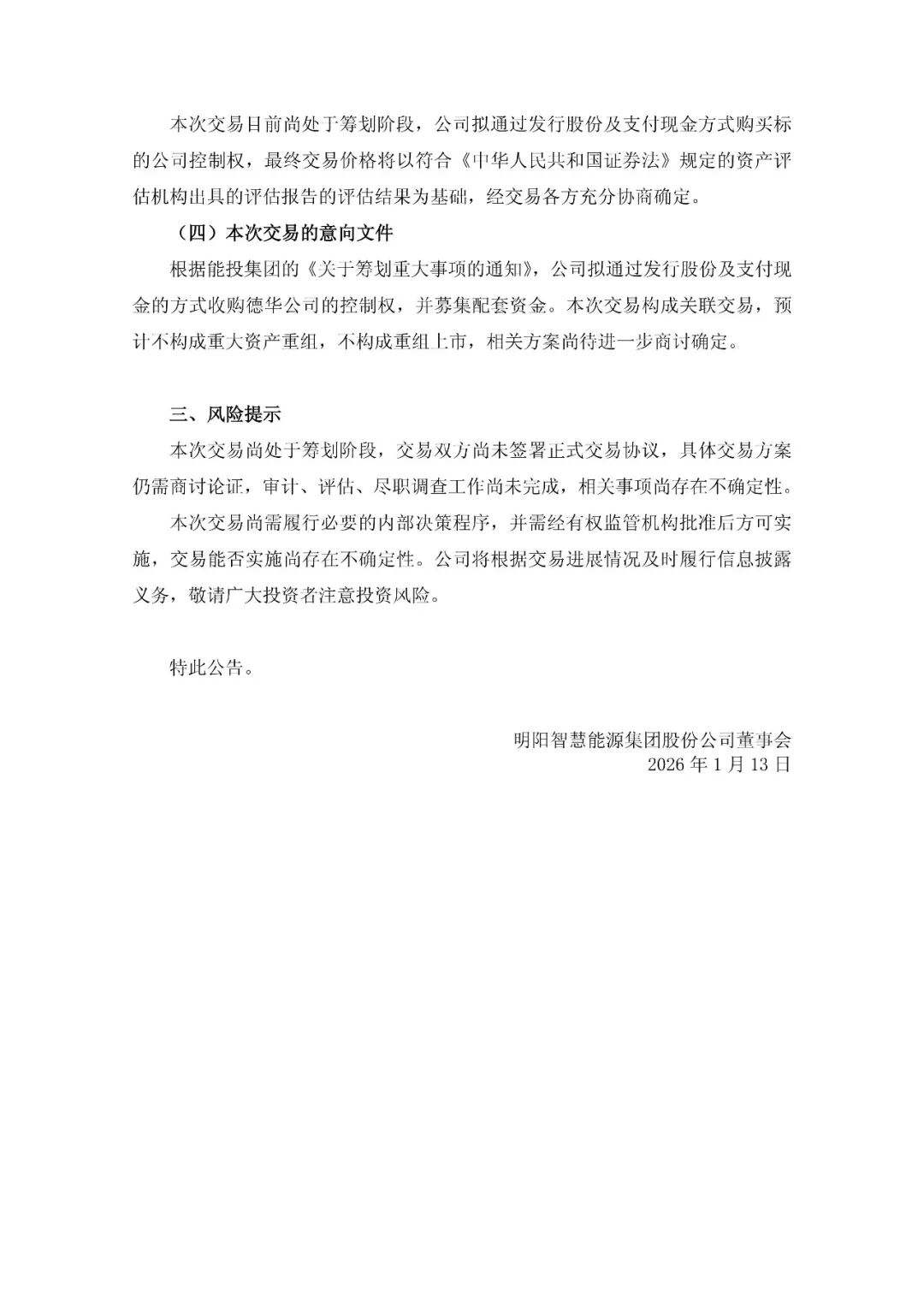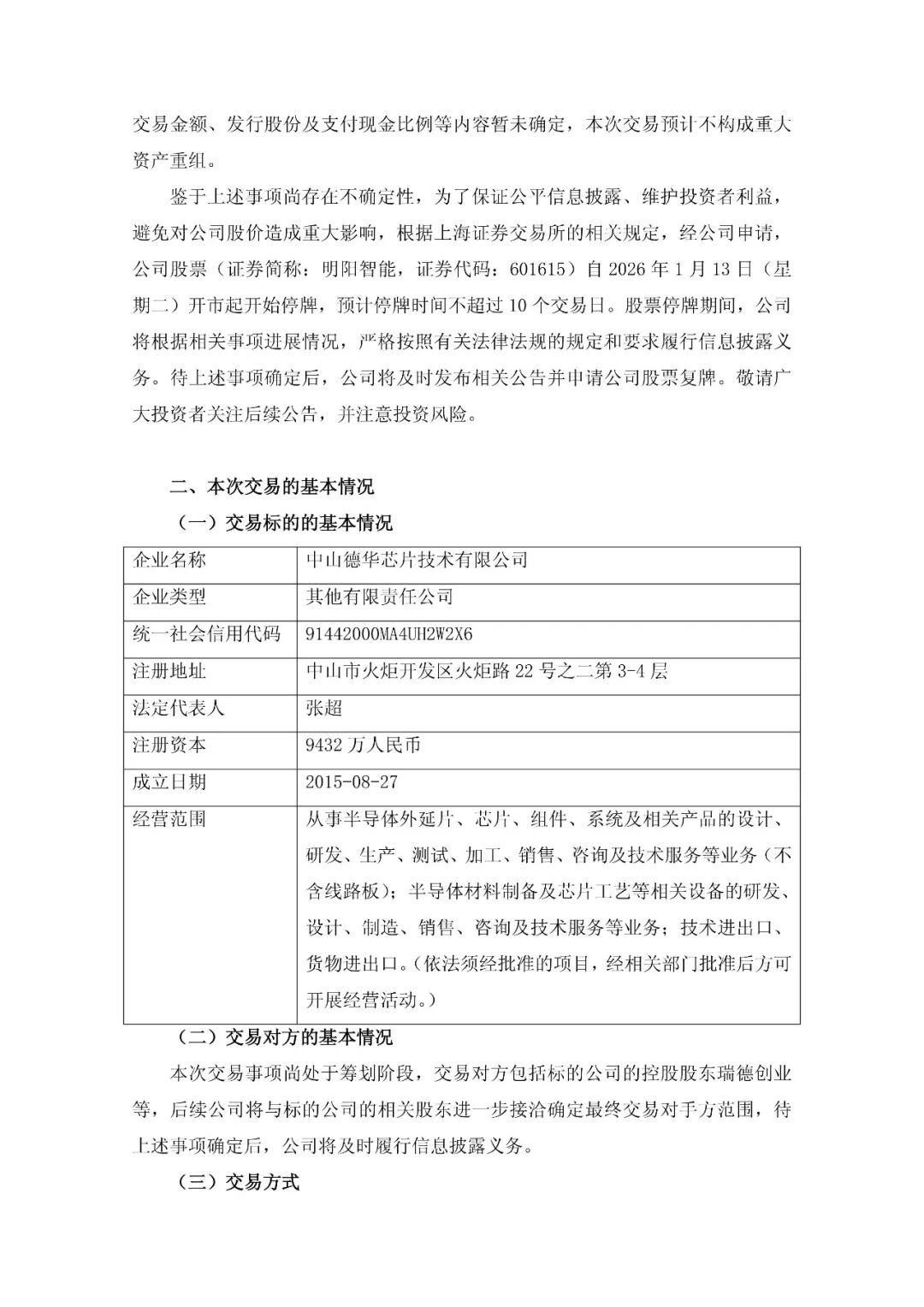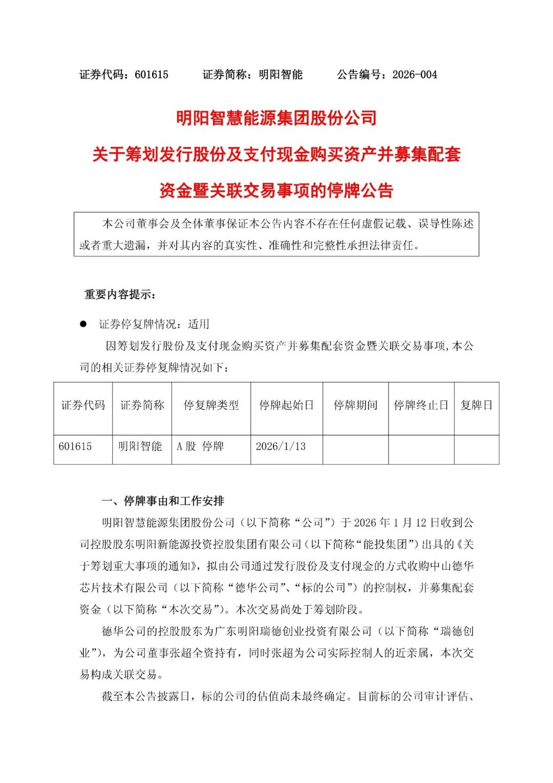 公告指出,明阳智能于2026年1月12日收到公司控股股东明阳新能源投资控股集团有限公司出具的《关于筹划重大事项的通知》,拟由公司通过发行股份及支付现金的方式收购中山德华芯片技术有限公司的控制权,并募集配套资金。本次交易尚处于筹划阶段。