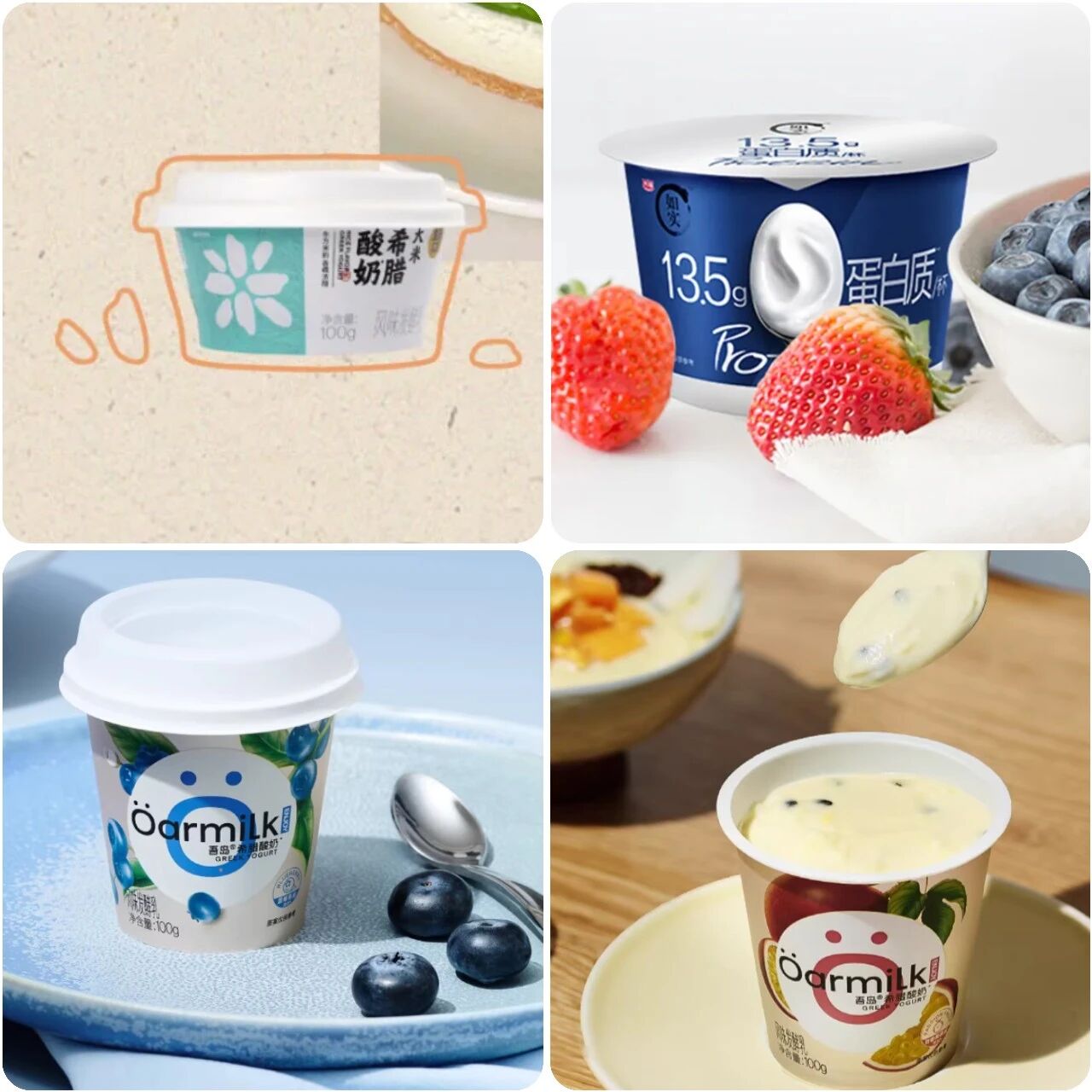 此外,部分产品也借助工艺、技术等实现营养价值的“质变”。例如,吾岛×盒马大米希腊酸奶选用已过滤掉多余乳清的希腊酸奶,每杯(100克)含7.4克原生乳蛋白;光明如实高蛋白希腊发酵乳,每杯(135克)蛋白质含量为13.5克;吾岛百香果希腊酸奶、蓝莓希腊酸奶均提出“由4倍生牛乳浓缩而成,含有3倍于国标的原生乳蛋白”。
