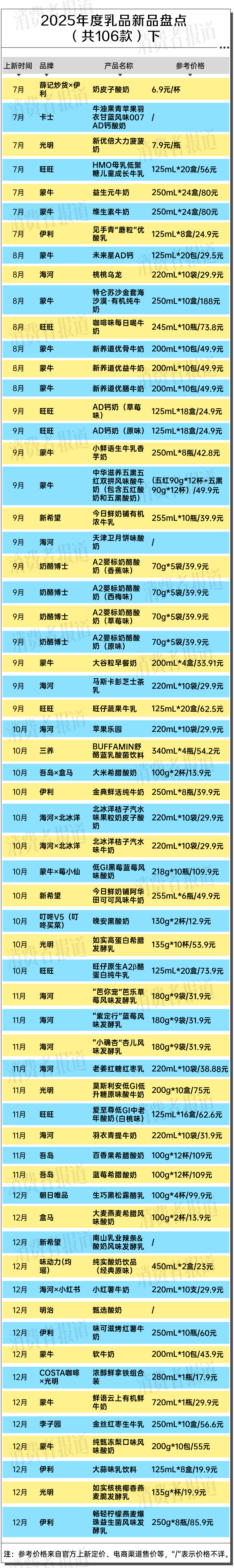 近日,《消费者报道》盘点了2025年度乳品行业推出的106款新品,一起来看看过去一年乳品行业都有哪些新口味、新技术、新概念。