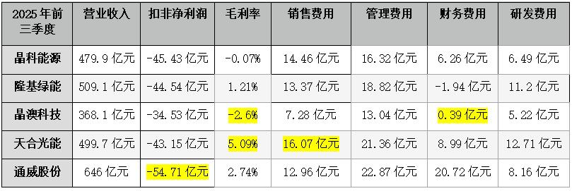 2025年前三季度,晶科能源、隆基绿能、晶澳科技、天合光能、通威股份扣非净利润分别亏损45.43亿元、44.54亿元、34.53亿元、43.15亿元、54.71亿元。