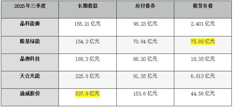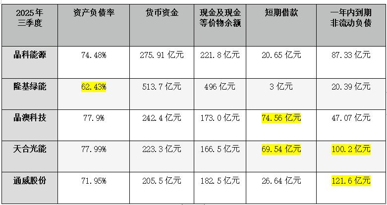 2025年3季度末,晶科能源、晶澳科技、天合光能、通威股份资产负债率均超过70%,晶澳科技、天合光能更是接近78%。隆基绿能相对偏低,但亦有62.43%。