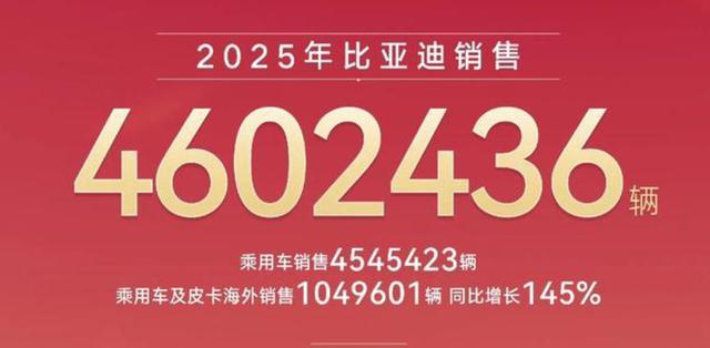 2025年,比亚迪汽车全年共销售4602436辆新车,同比增长7.73%,连续2年销量突破400万辆,荣获中国汽车市场车企销量冠军、中国汽车市场品牌销量冠军、全球新能源市场销量冠军。