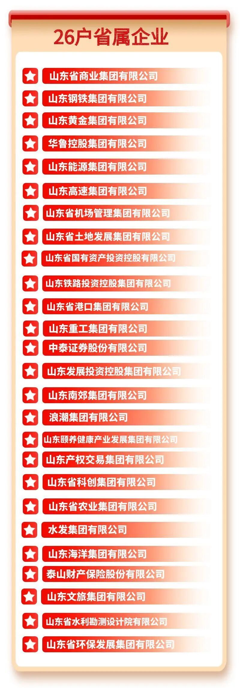 26户省属企业包括山东省商业集团有限公司、山东钢铁集团有限公司、山东黄金集团有限公司、华鲁控股集团有限公司、山东能源集团有限公司、山东高速集团有限公司等。