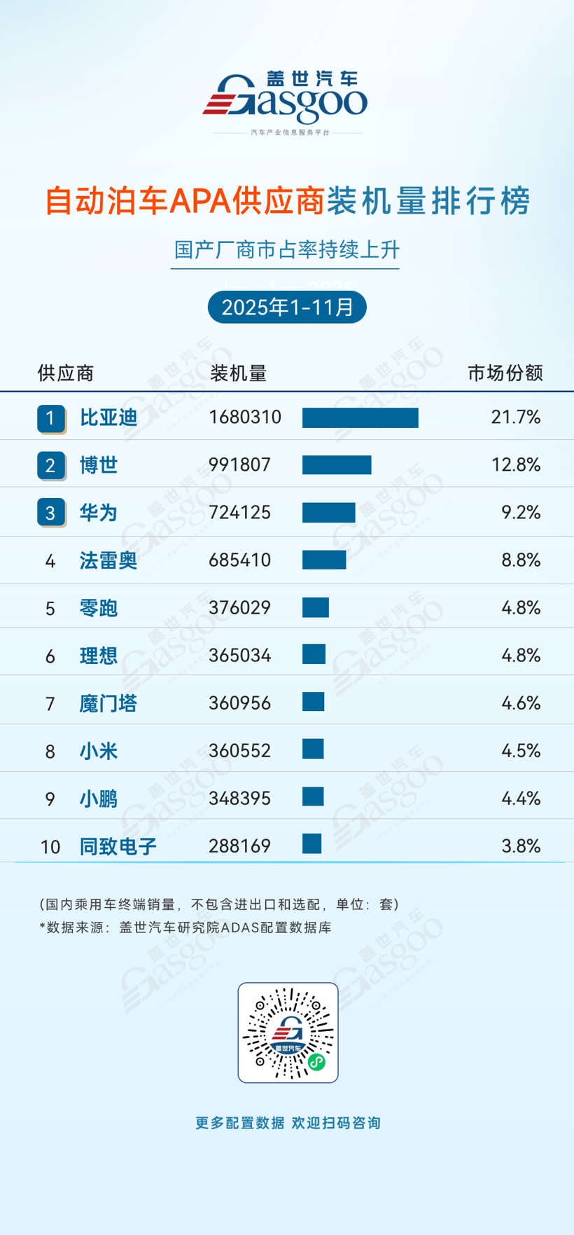 2025年1-11月国内自动泊车(APA)供应商装机量的格局,呈现出“国产阵营全面领跑、自研与第三方方案双轮驱动”的鲜明特点:比亚迪以1,680,310套装机量稳坐第一,其份额维持21.7%的高位,这背后是其APA方案与旗下车型的深度绑定,实现了交付端的规模化放量;而华为、魔门塔等第三方供应商,与零跑、理想等整车厂自研方案同台竞技,共同挤压了博世、法雷奥等外资厂商的空间——外资供应商仅占不足25%的份额,国产势力已成为APA市场的绝对主力。值得注意的是,国产APA方案的“多元化”是此次格局的核心看点:既有比亚迪、小鹏这类整车厂的自研方案,也有华为、魔门塔这类第三方供应商的通用方案,不同路径均实现了高装机量,说明国产APA技术已摆脱单一依赖,在适配性、功能体验上都形成了差异化竞争力。