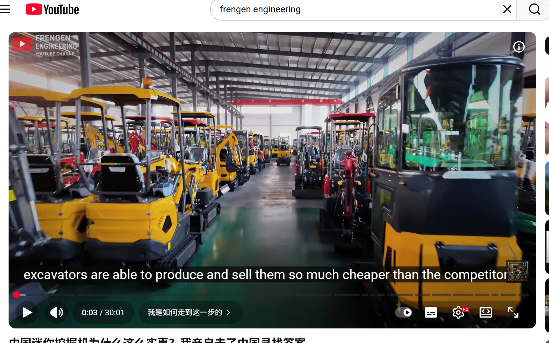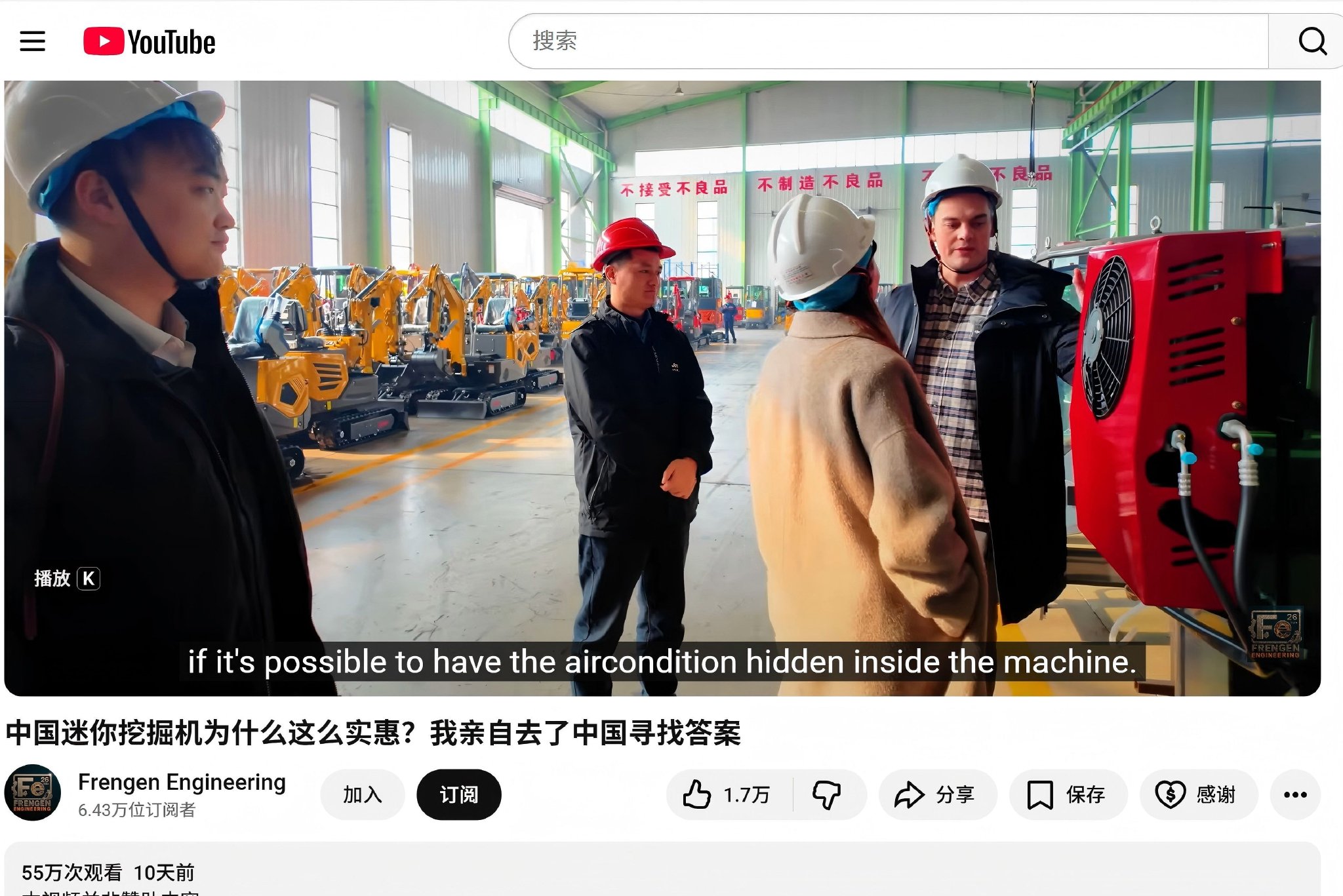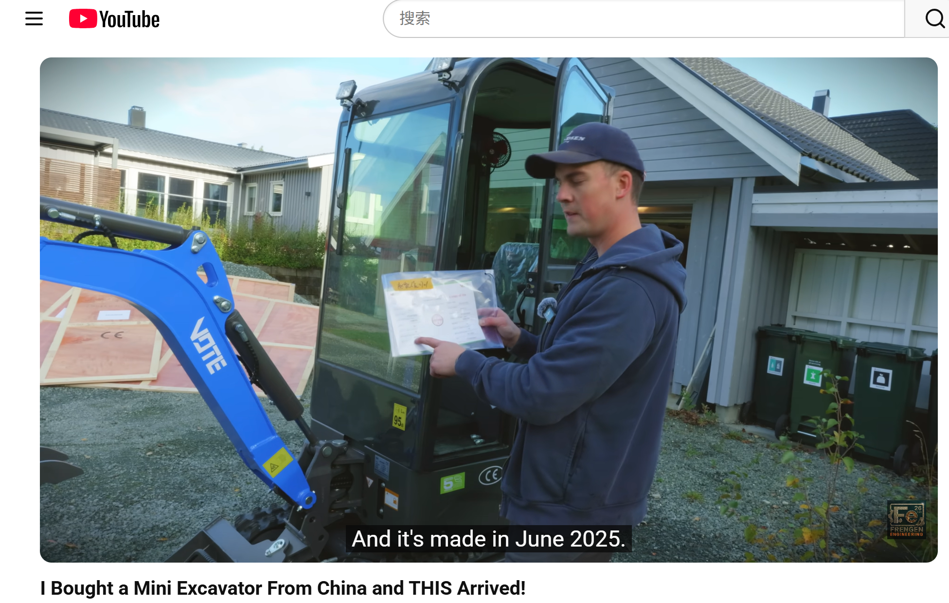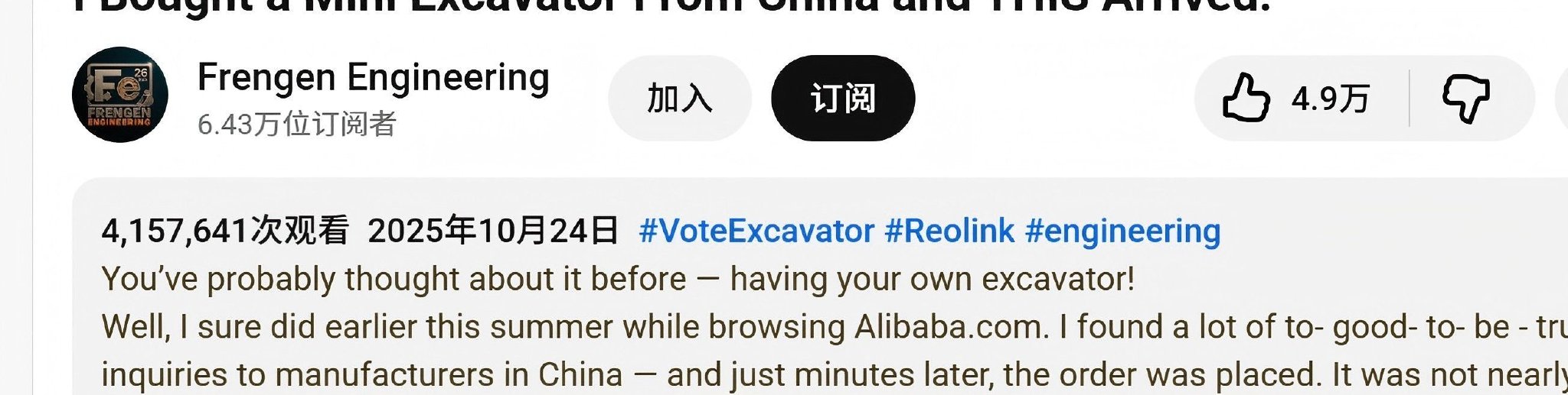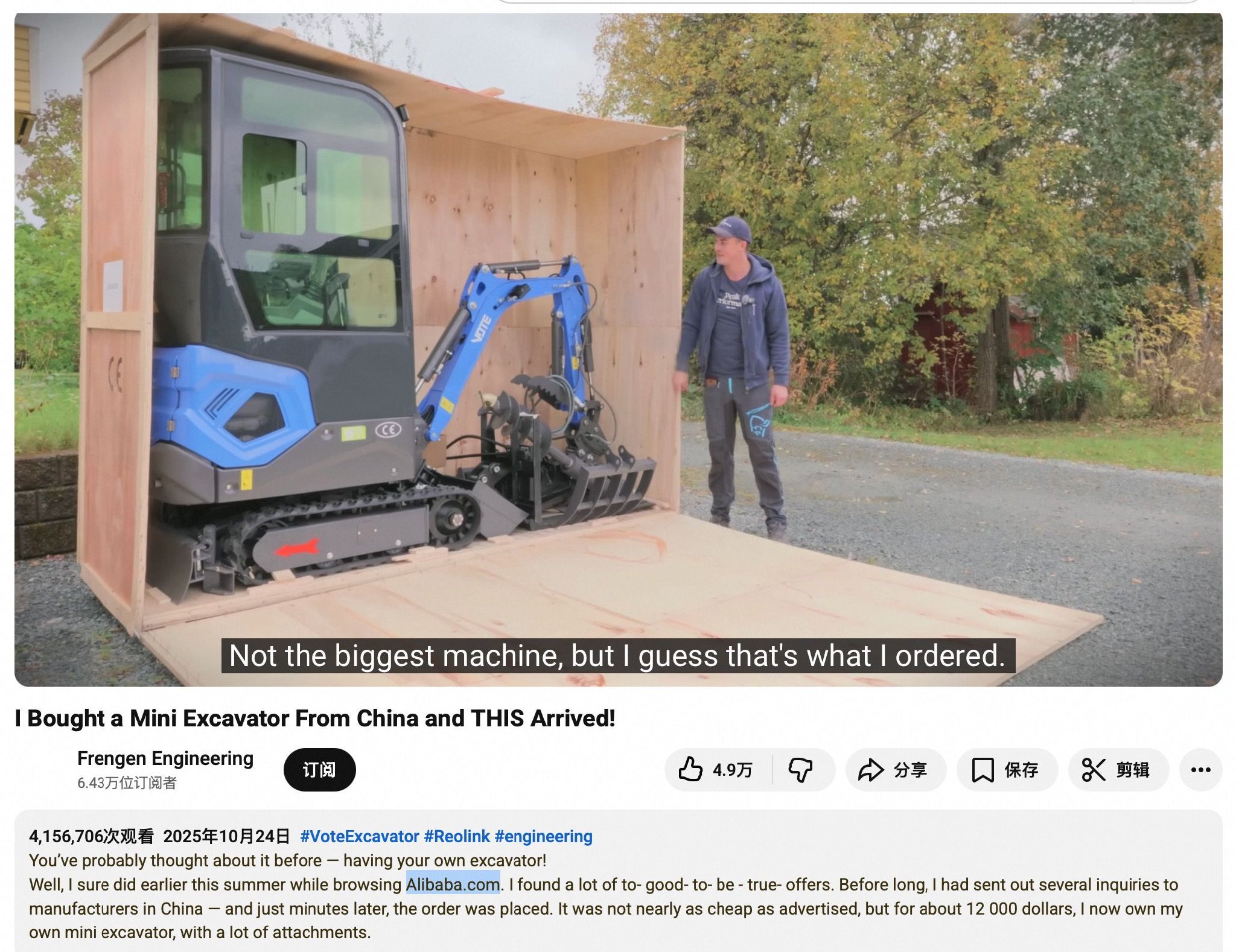 2025年底,YouTube上一个海外视频爆火。据了解,这个爆火视频拍摄者是一位名叫Frengen Engineering的DIY博主。当时还是在2025年夏季,住在挪威的Frengen只是在逛阿里国际站时,发现中国的制造商的产品价格非常便宜。研究几分钟后,他就下单了一台小型迷你挖掘机,大概是12000美元。