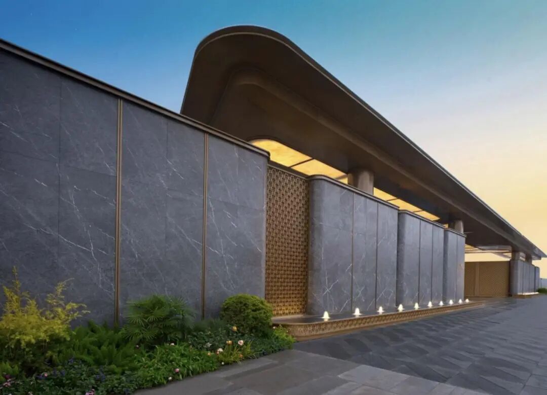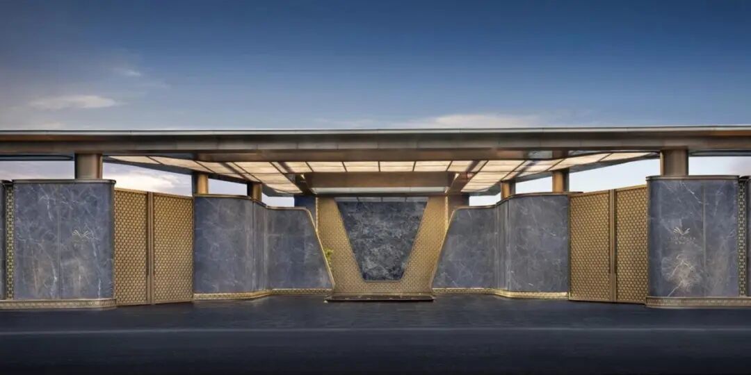 约95米宽的超级归家界面,以45米宽奢石铺装串联流转水景,尽头背景墙选用蓝翡翠奢石铺贴,结合金属网镂空外墙塑造的鲸鱼尾艺术造型,彰显震撼气场。