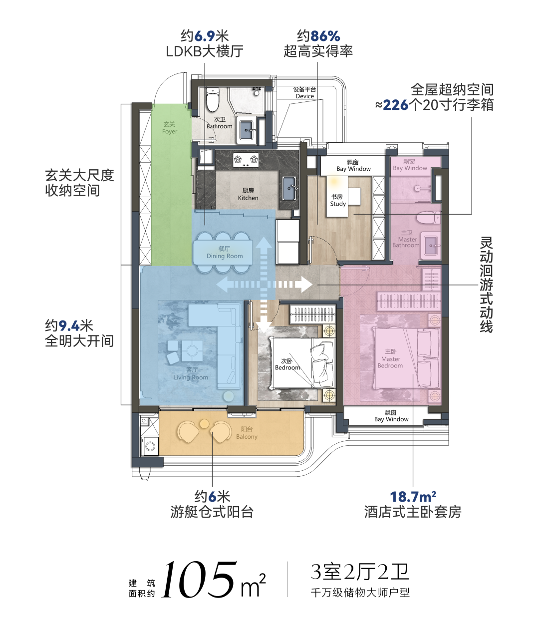 项目主打建面约105-143㎡的3-4房,其中,建面约105㎡的三房堪称功能与舒适兼具的典范。