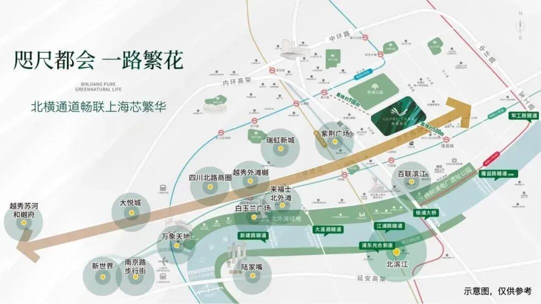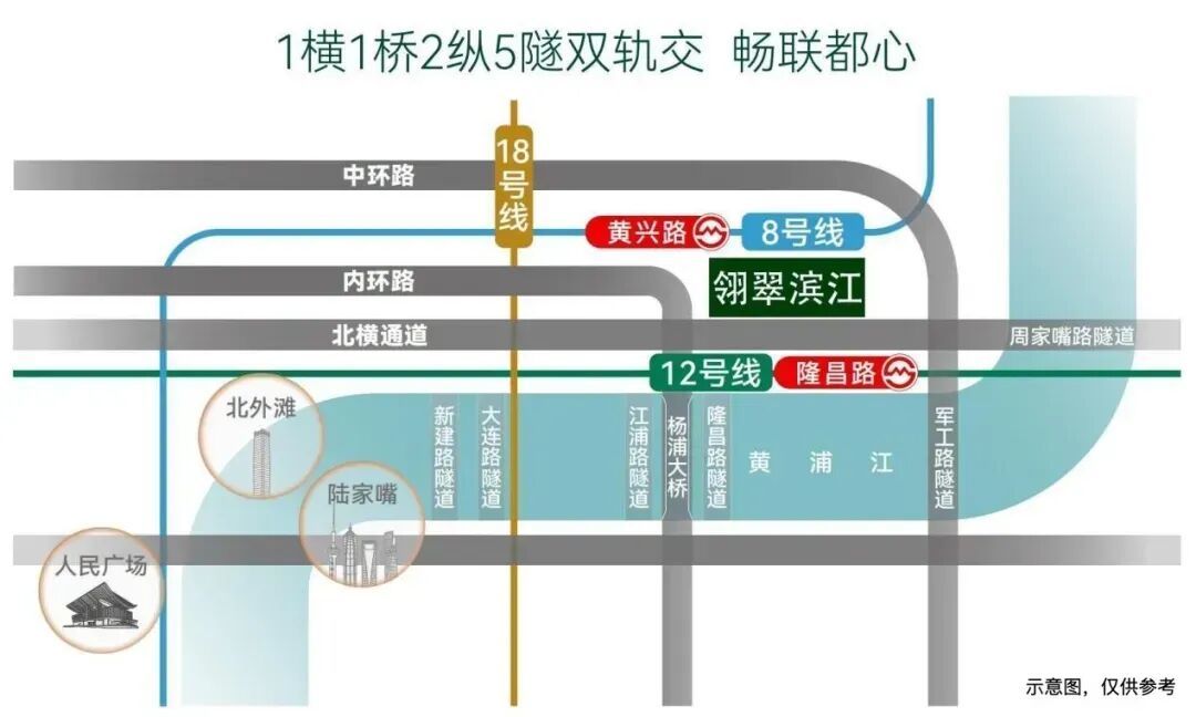 交通方面,翎翠滨江坐拥“双地铁三快速路五隧道”的立体路网,轻松联通全市核心商务区。项目更处于北横通道黄金十字,距入口仅约350米,约12分钟可达北外滩,约15分钟直抵陆家嘴,同步串联瑞虹太阳宫、北外滩来福士等顶流商圈。