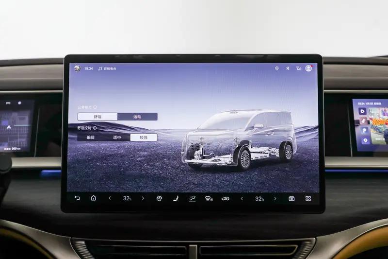 底盘技术上,腾势D9搭载比亚迪全栈自研的云辇-C智能阻尼车身控制系统,成为同级别车型中率先配备该技术的产品。该系统由云辇智算中心、电控减振器等核心组件构成,可通过每秒上千次信号输入与微秒级响应,实现阻尼无级自适应调节。在颠簸路面采用高频小阻尼策略,60km/h工况下隔振率达96%,有效过滤路面颠簸;急转或制动时切换至低频大阻尼模式,双移线工况侧倾角速度降低39.7%,大幅提升车身稳定性。