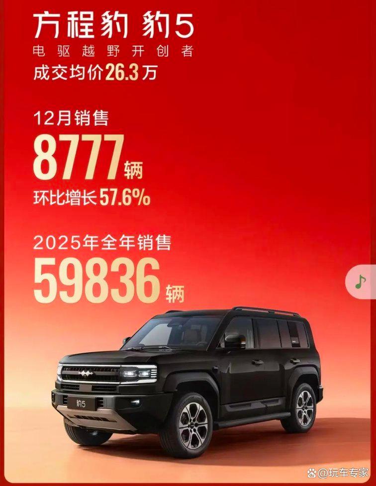在其带动下,比亚迪、奇瑞等车企纷纷入局,方程豹豹5便是比亚迪旗下方程豹品牌的首款硬派SUV车型。历经市场检验后,这款搭载新能源技术的硬派车型迅速获得认可,2025年销量表现尤为亮眼,也由此成为坦克300的强劲对手。