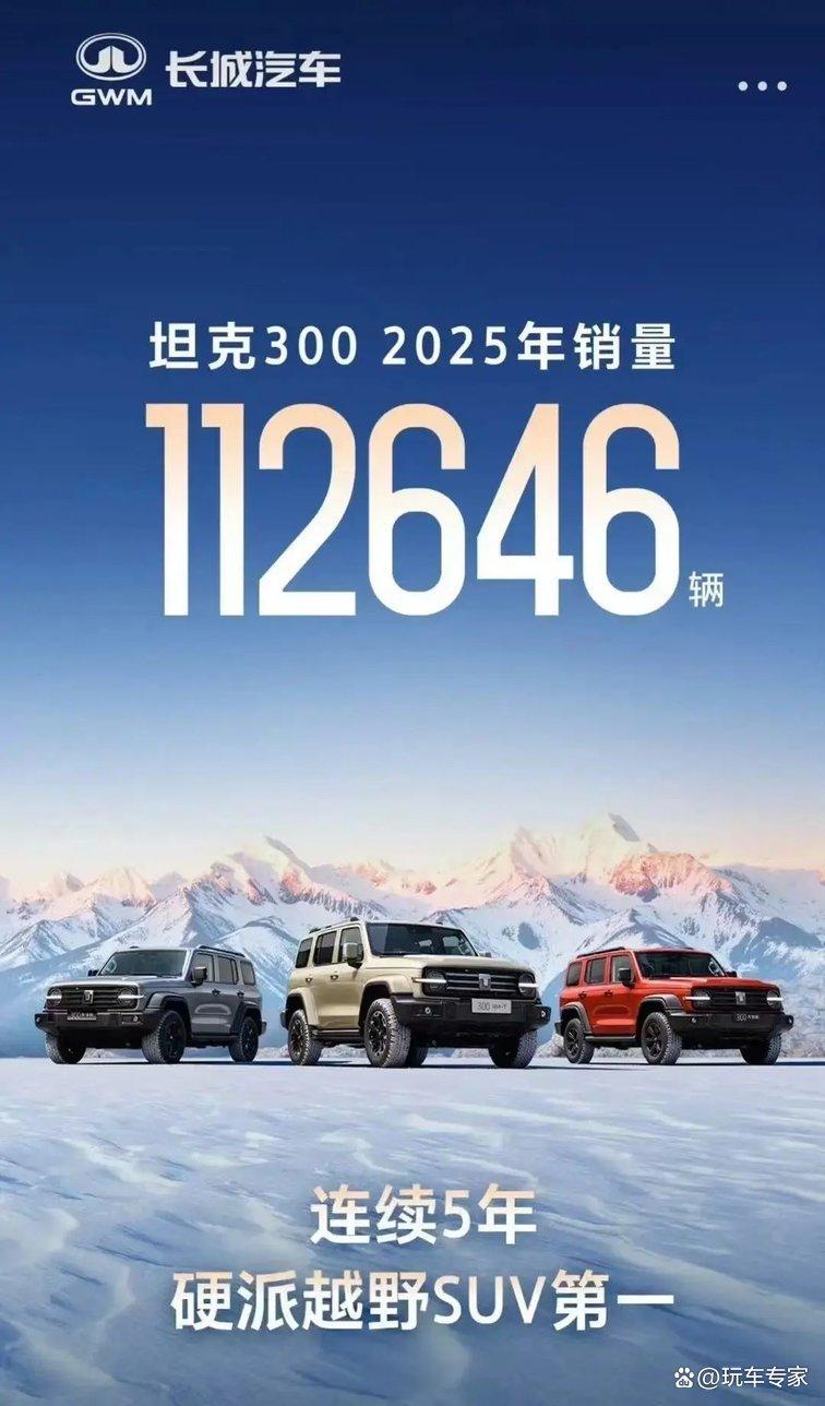 正是两款车的市场热度,让这场“销冠之争”颇具看点。长城汽车率先发布海报,宣称2025年坦克300销量达112624辆,实现“连续5年硬派越野SUV第一”的成就,数据看似极具说服力。