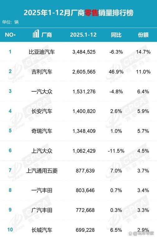 2025乘联会车企销量榜出炉:自主车企强势领跑,吉利成增长王