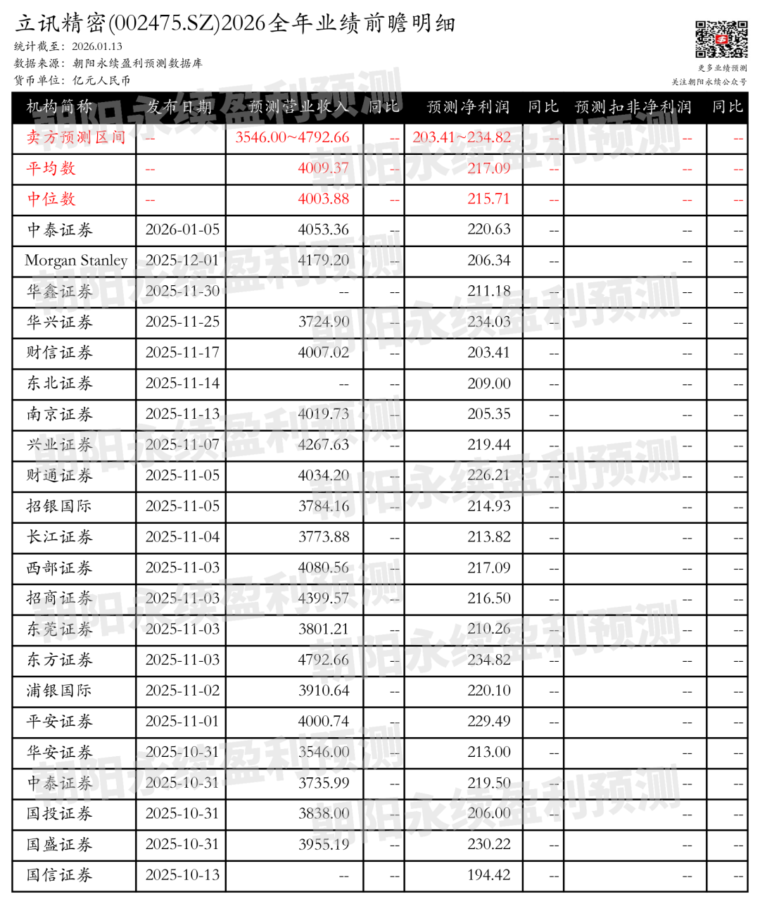 截至2026年01月13日,根据朝阳永续季度业绩前瞻数据: