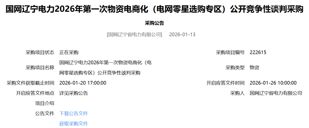 国网辽宁电力2026年第一次物资电商化(电网零星选购专区)公开竞争性谈判采购项目