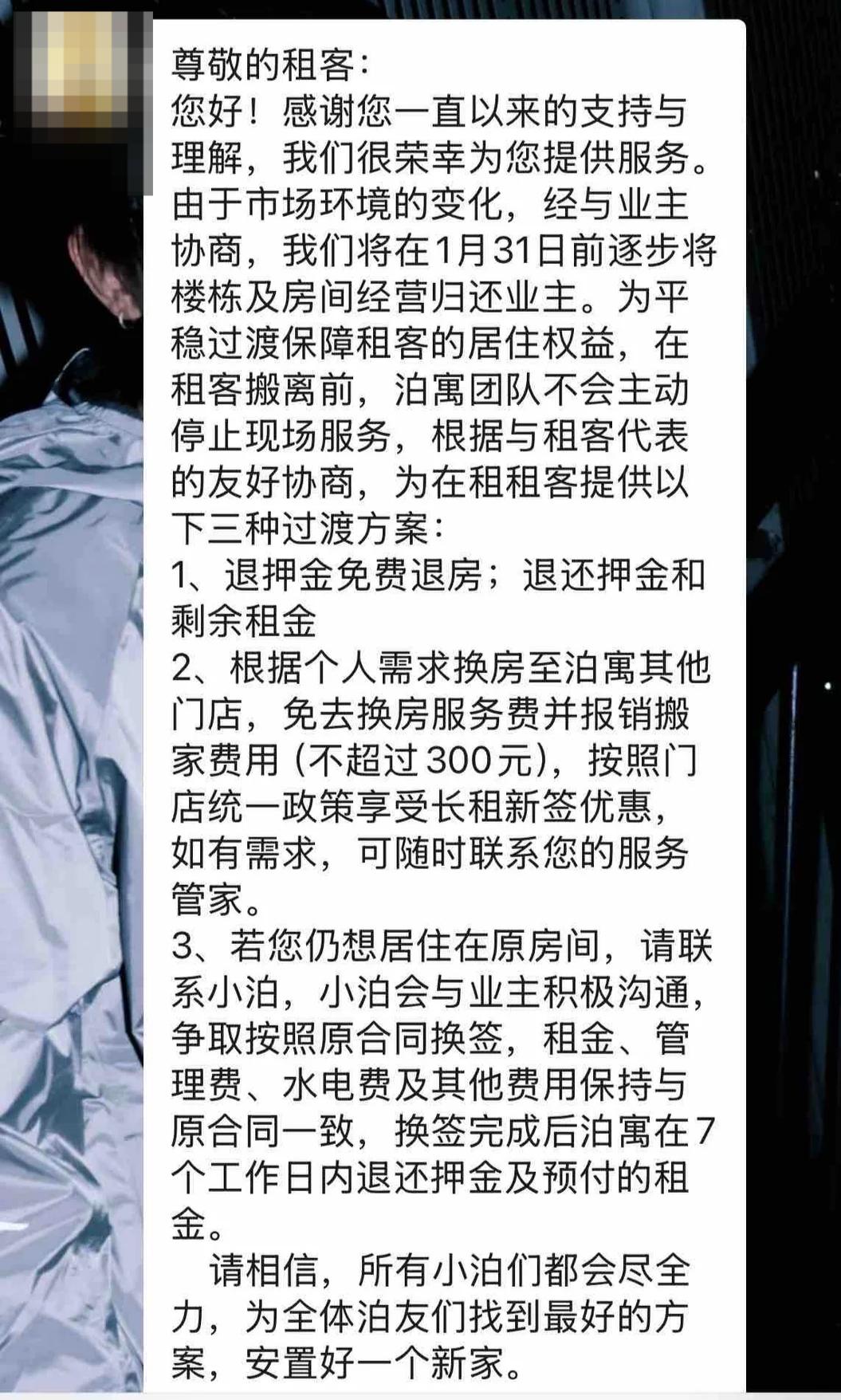 湖里步行街泊寓管家表示:“我们也是收到公司通知,按照公司做法去执行,能否续住还要跟房东沟通。”该管家称,租户赔偿等诉求将统一反馈给公司,后续要等公司的具体方案。1月31日后,湖里步行街门店会撤出,押金和剩余房租会一起退给租户。