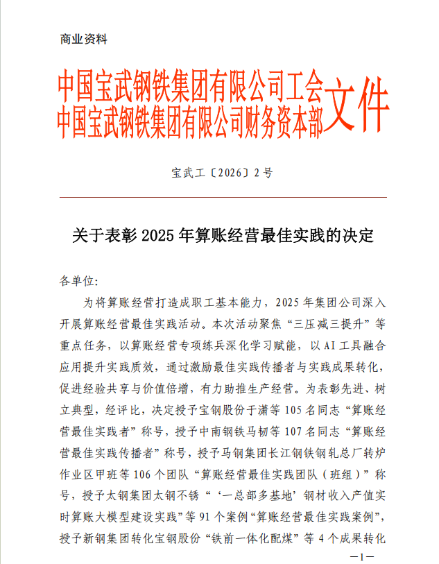 近日,中国宝武钢铁集团有限公司工会、财务资本部联合印发《关于表彰2025年算账经营最佳实践的决定》(宝武工〔2026〕2号),中钢洛耐低碳高性能材料分厂报送的《挂釉炉门砖技术迭代升级驱动降本实践》案例,凭借显著的降本成效与扎实的实践经验,成功获评“算账经营最佳实践案例”。