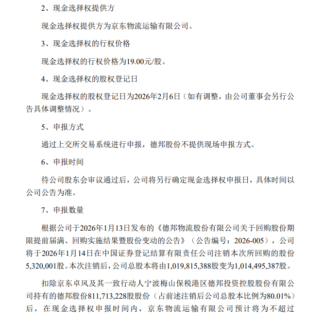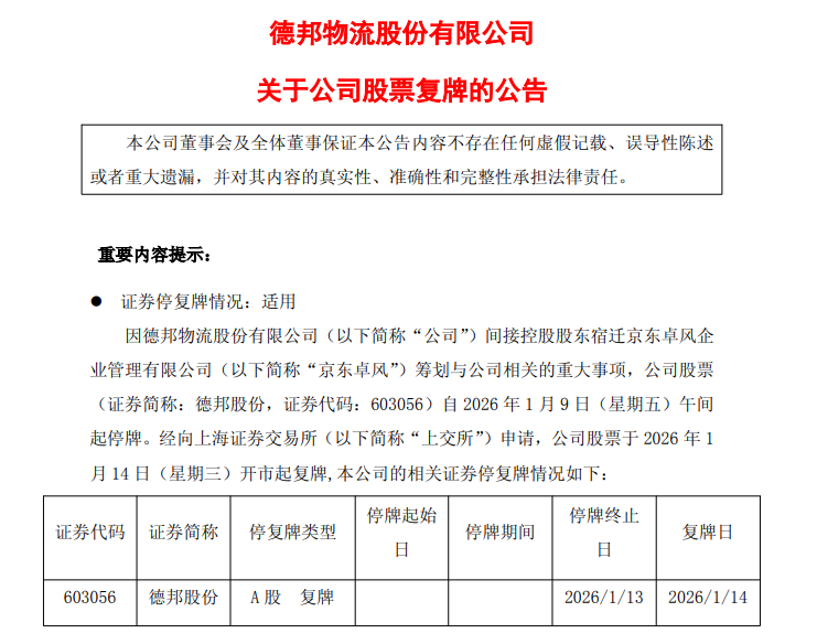 因筹划本次终止上市事项,德邦股份 A 股股票已于2026 年1 月9 日午间起停牌,并于 2026 年 1 月 14 日起复牌。停牌前,德邦股份市值为143亿;每股19元的价格主动退市,该价格较停牌1月9日市价溢价超35%,对应市值超190亿元。