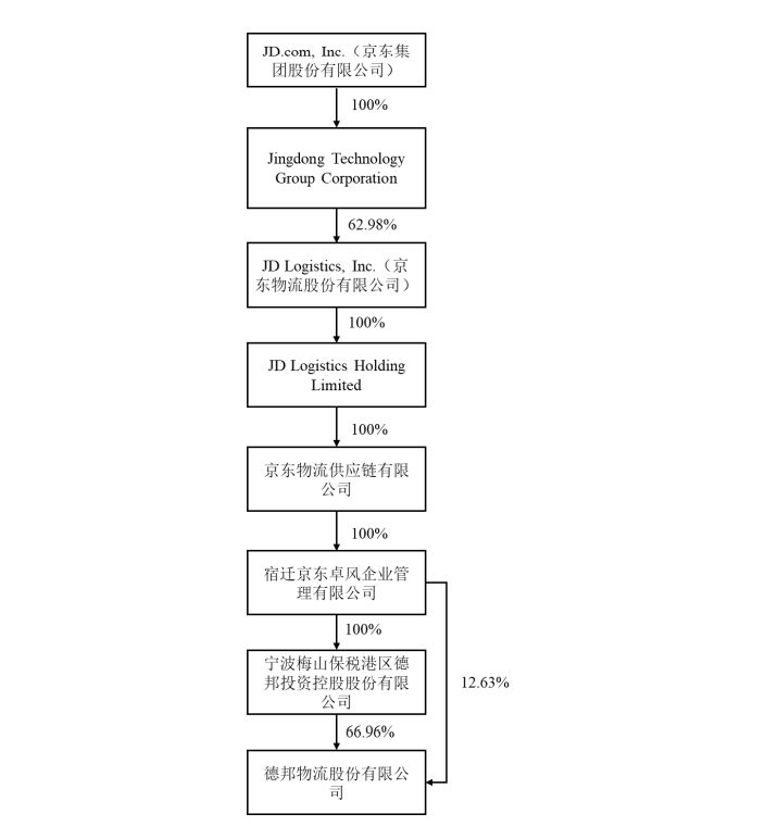 截至1月13日,德邦股份总股本为 1,019,815,388 股,均为无限售条件的流通股。其中,德邦控股持有公司 682,890,461 股股份,占公司总股本的 66.96%,为公司的控股股东。京东集团股份有限公司通过德邦控股及京东卓风合计持有公司 811,713,228 股股份,占公司总股本的 79.59%的股份。