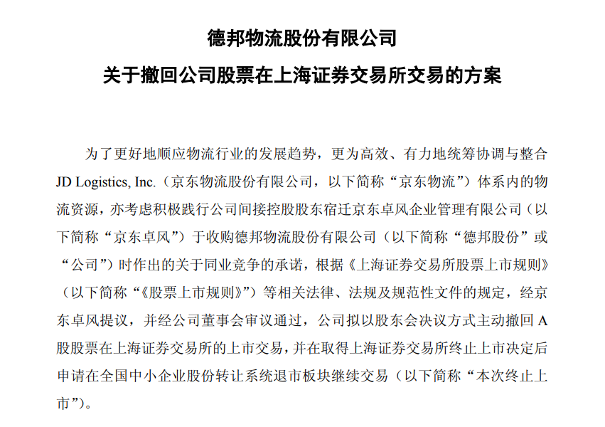 资本永不眠!德邦股份宣布退市!上市到退市7年。