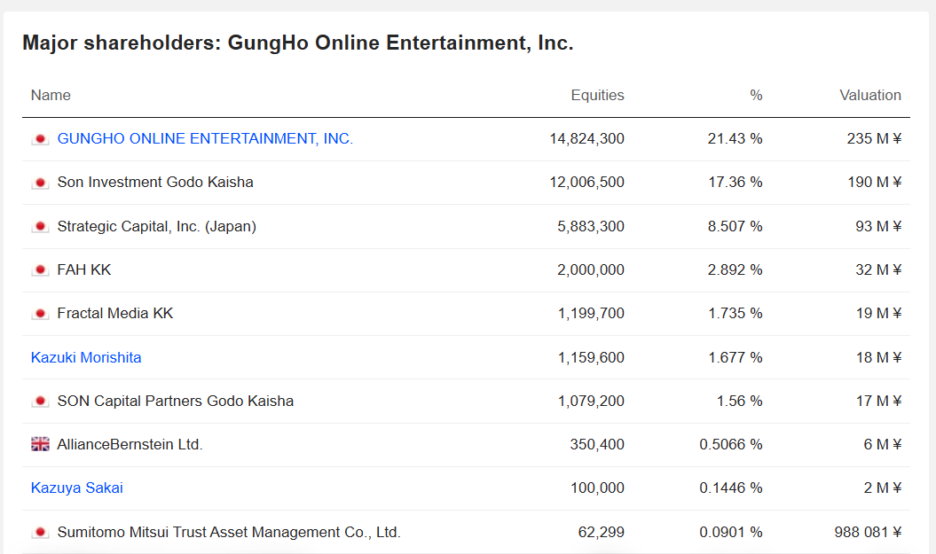 GungHo 的股价随之飞涨,市值一度超越了老牌游戏巨头任天堂,森下一喜也因此被誉为“手游时代的领军人物”,其巨大的名声,以至于中国游戏圈很多人都有种错觉,误认为以为森下一喜是Gungho大老板,但其实他是持股Gungho并不多的“最强经理人”,孙正义的弟弟孙泰藏至今为止仍然是Gungho的大股东。