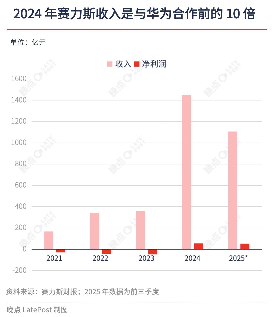 而从 2022 年以来,赛力斯累计付给华为的采购费用超过 750 亿元——但这也比赛力斯合作前亏损近百亿元、濒临倒闭的处境好太多。双方的合作始于 2021 年,那时双方都没有太多选择。新能源转型投入巨大却持续亏损的赛力斯急需技术与品牌“翻身”,华为则在与上汽、广汽合作受阻后,寻找更顺畅的合作方。