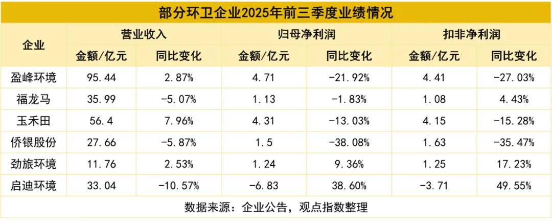 2025前三季度,盈峰环境录得营收95.44亿元,同比增长2.87%;归母净利润同比下滑21.92%至4.71亿元;反映核心业务持续盈利的扣非净利润指标同比下滑27.03%至4.41亿元。
