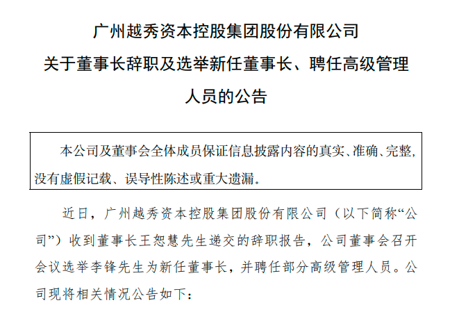 昨日,广州越秀资本控股集团股份有限公司发布重磅人事公告,因工作变动,原董事长王恕慧辞去公司董事长等全部职务。