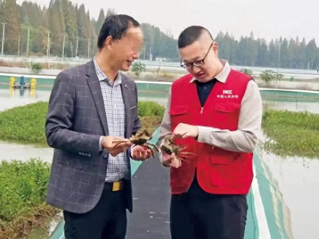 ▲中国人保理赔员将服务送到螃蟹养殖塘口
