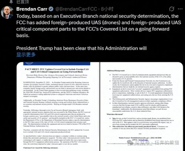 下图:去年12月22日,美国联邦通信委员会将所有外国制造无人机及组件列入受管制"黑名单",禁止外国无人机在美销售(图源:狂奔的熊猫)