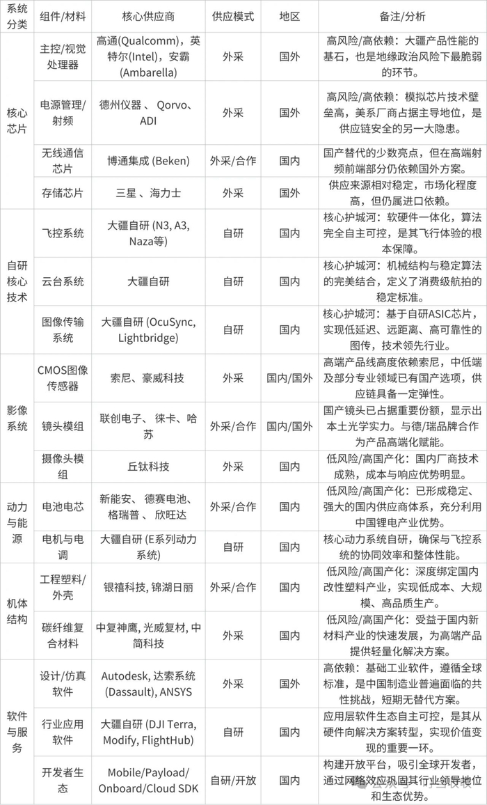 下图:截至2025年8月,大疆无人机供应链生态系统核心供应商清单(图源:叮当收收)