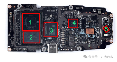 下图:大疆无人机主板拆解:高度集成自研芯片(如H6处理器)与外购存储芯片(如SK海力士、三星)的协同工作(图源:叮当收收)