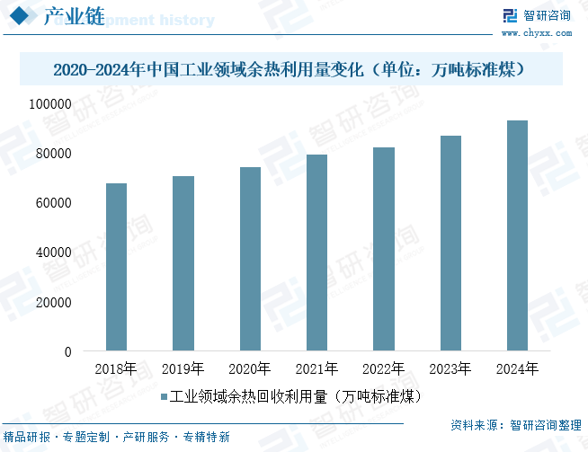 相变储能蜡作为一种高效节能的热管理材料,已广泛应用于工业余热回收、建筑节能、冷链物流、电子设备热管理及纺织服装等多个领域。近年来,在“双碳”政策持续推动以及高耗能行业加快技术改造的背景下,工业领域余热回收利用规模实现稳步提升。《2024—2025年节能降碳行动方案》明确提出,钢铁行业余热余压余能自发电率需提升3个百分点以上,并安排中央财政节能降碳专项资金685亿元,其中约18%直接用于支持余热回收技术改造项目。在政策红利持续释放的推动下,钢铁、水泥等重点行业余热回收项目加快落地,带动整体利用量不断攀升。2024年,工业领域余热回收利用量已达约93125万吨标准煤。这一持续扩张的余热回收市场,为相变储能蜡行业带来广阔的应用空间与强劲的发展动力。