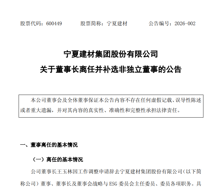 公告显示,宁夏建材董事长王玉林因工作调整申请辞去宁夏建材集团股份有限公司(以下简称公司)董事、董事长及董事会战略与ESG委员会主任委员、委员各项职务。