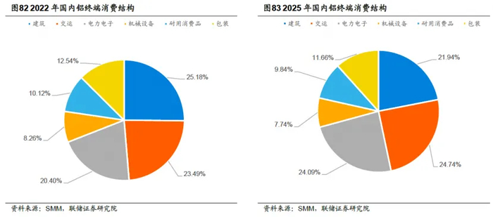 其次,从铝的供需博弈角度看,刚性供给约束自不消多说,国内电解铝行业早已明确形成约4500万吨的产能总量“天花板”;而在需求侧,过去三年,国内电解铝的消费结构经历了显著重构。随着房地产市场景气度系统性下行,其作为电解铝第一大消费领域的地位已被取代。数据显示,建筑地产领域在电解铝消费总量中的占比已从2022年的25.18%下降至2025年的21.94%,降幅达3.24个百分点,位次退居第三。同期,退出份额主要由交通运输与电力电子两大领域承接。两者占比分别从23.49%和20.4%,显著提升至24.74%和24.09%,成为驱动铝消费增长的新核心动力。