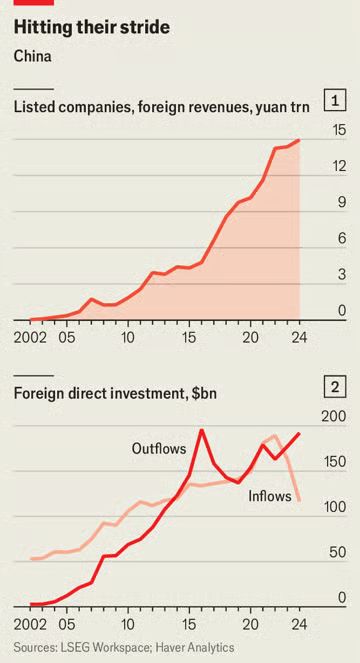 一年又一年,中国企业在海外的存在感日益增强,无论是在富裕国家还是发展中经济体,覆盖的行业范围也在不断拓宽。去年,中国电动汽车制造商比亚迪(BYD)在全球销量上超越了美国电动车领军企业特斯拉。其销往海外的汽车占比已从2024年的10%上升至超过20%。中国的AI大模型如今不仅在“全球南方”广泛应用,甚至被Airbnb等西方企业采用。