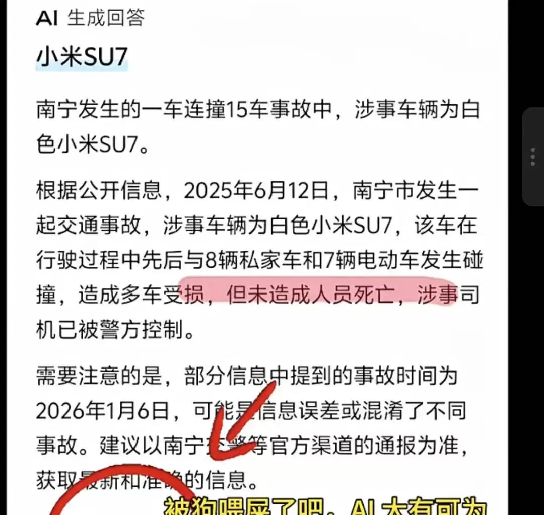 类似的还有南宁一车连撞15车,最后又套路惯用在AI问答中,被移花接木陈饿了小米车祸。