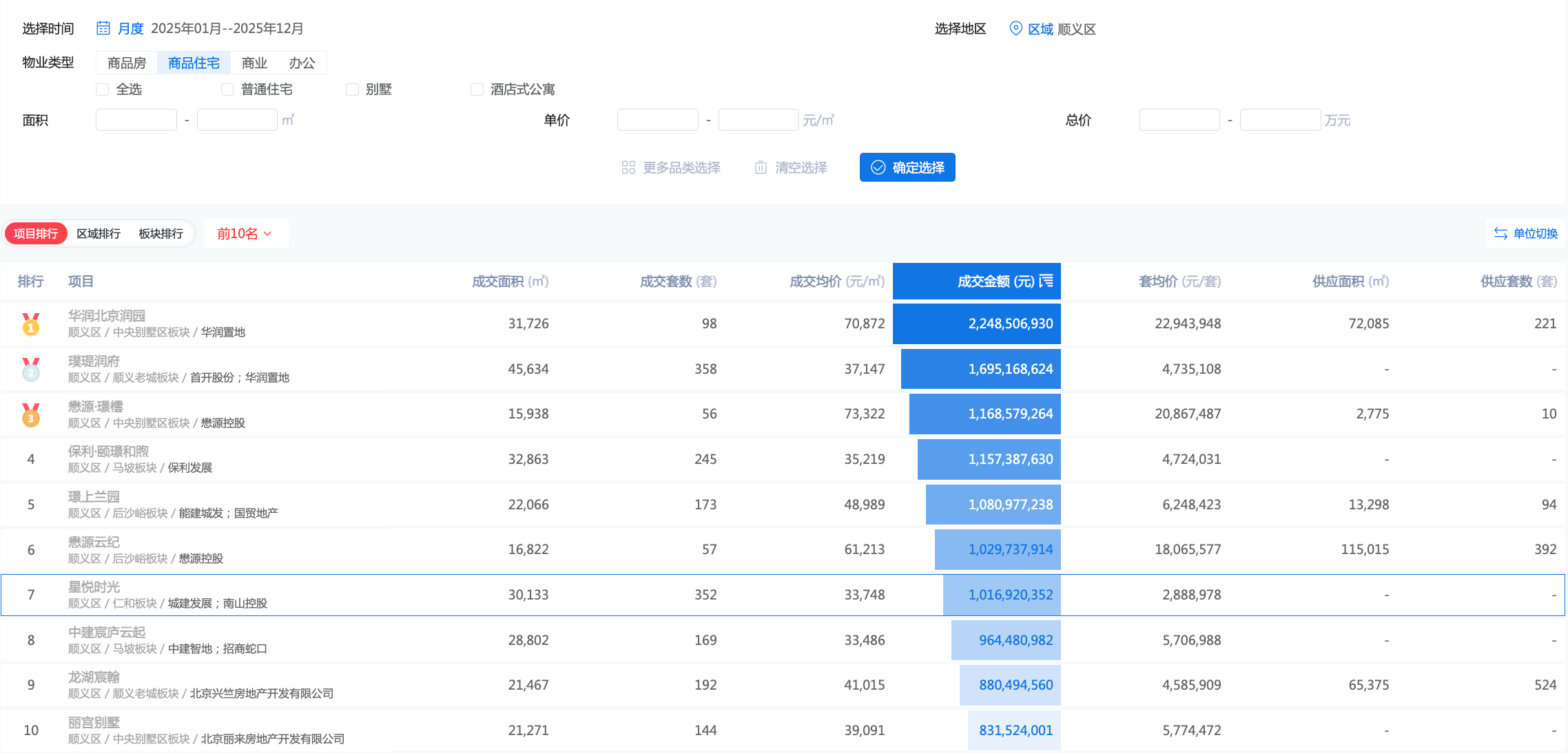 北京进深徐迪顺义区2025年度商品住宅网签金额排行榜显示,星悦时光以10.17亿元的成绩排名第7位。