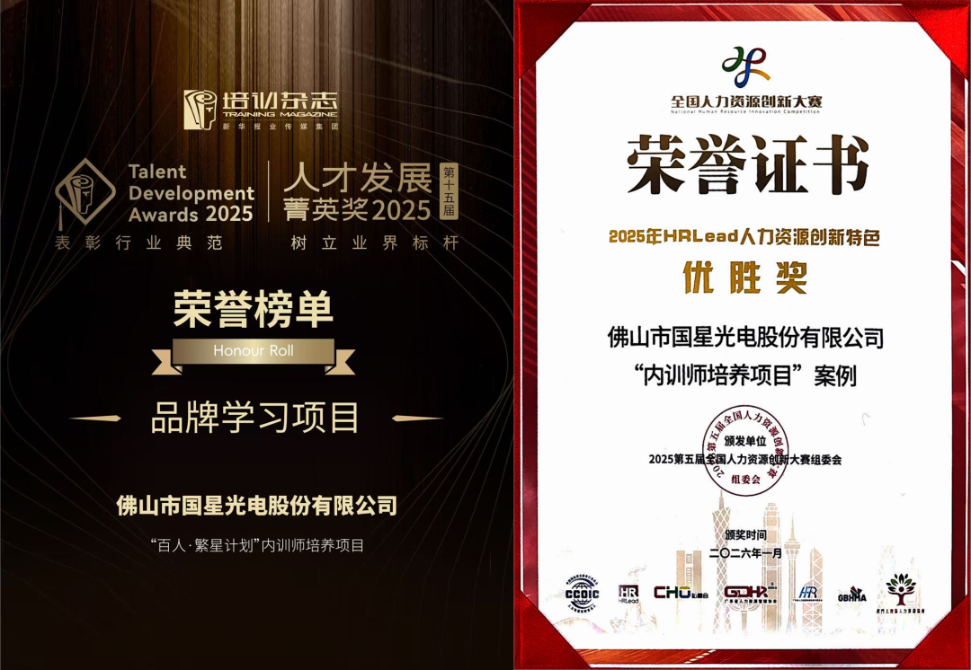 近日,国星光电“百人·繁星计划”内训师培养项目连获两项行业大奖——《培训》杂志2025(第十五届)人才发展菁英奖——品牌学习项目、第五届全国人力资源创新大赛——创新特色案例类优胜奖。