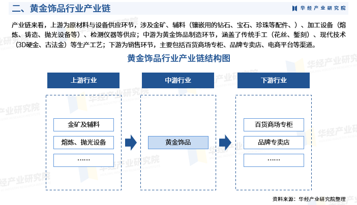 产业链来看,上游为原材料与设备供应环节,涉及金矿、辅料(镶嵌用的钻石、宝石、珍珠等配件、)、加工设备(熔炼、铸造、抛光设备等)、检测仪器等供应;中游为黄金饰品制造环节,涵盖了传统手工(花丝、錾刻)、现代技术(3D硬金、古法金)等生产工艺;下游为销售环节,主要包括百货商场专柜、品牌专卖店、电商平台等渠道。