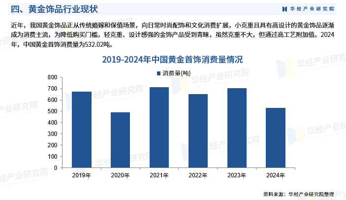 近年,我国黄金饰品正从传统婚嫁和保值场景,向日常时尚配饰和文化消费扩展,小克重且具有高设计的黄金饰品逐渐成为消费主流,为降低购买门槛,轻克重、设计感强的金饰产品受到青睐,虽然克重不大,但通过高工艺附加值。2024年,中国黄金首饰消费量为532.02吨。