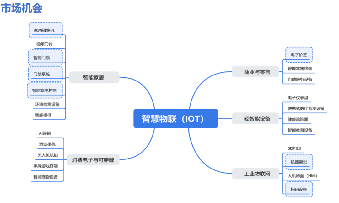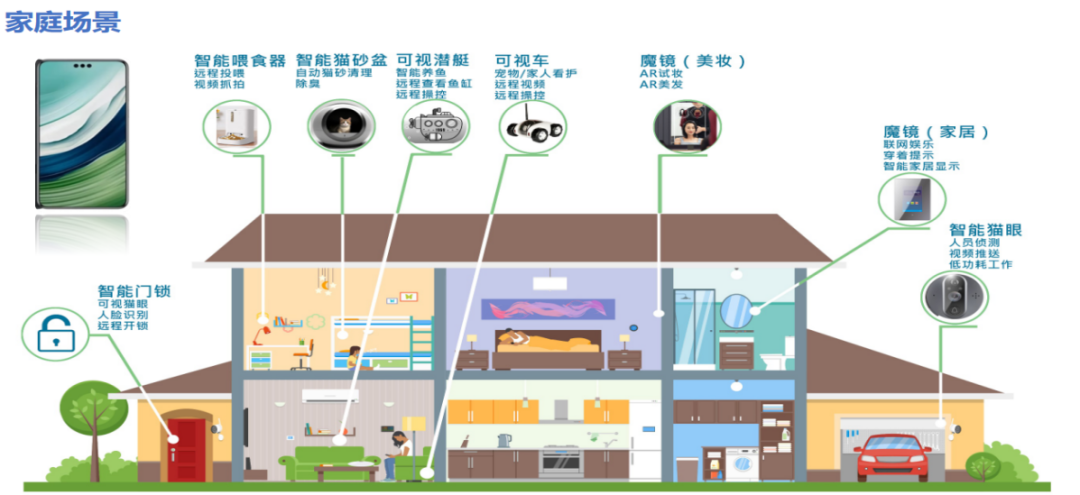 智能家居:智能门锁(人脸识别、远程开锁、视频抓拍)、智能猫眼(人员侦测、视频推送、低功耗工作)、魔镜(美妆场景支持AR 试妆/美发,家居场景支持联网娱乐、穿着提示和智能家居显示)、智能家电控制终端;
