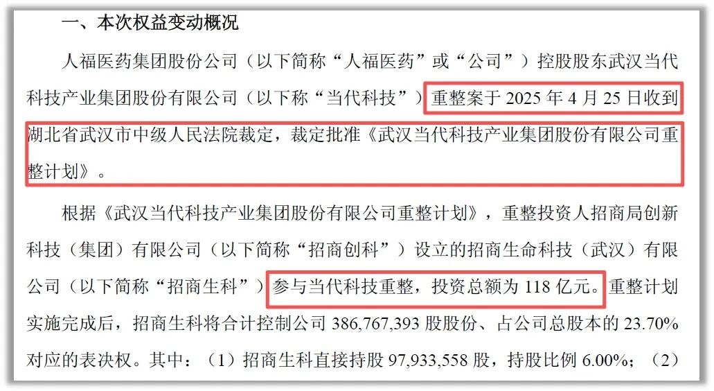 2025年6月28日,人福医药公告称,招商科创参与了当代集团的重整,以118亿元获得了公司的控股权。