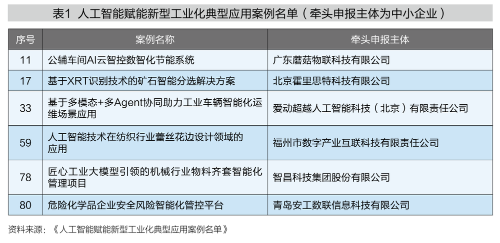 另一方面,重点行业内由人工智能赋能的企业以大型企业为主,中小企业相对有限。工业和信息化部于2024年12月31日公示《人工智能赋能新型工业化典型应用案例名单》,该名单聚焦人工智能赋能的钢铁、有色、石化、化工、建材、机械、汽车、电力装备、轻工、电子等制造业十大行业,遴选出行业应用类案例总计89例。三类企业是牵头申报的重要主体,一是能源、基建等领域的央企或国企集团及子公司,二是以宁德时代、海尔智家、京东方为代表的制造行业上市龙头企业,三是以朗坤智慧、商汤科技为代表的科技行业龙头企业。以广东蘑菇物联、北京霍里思特为代表的中小企业占比不足10%(见表1)。