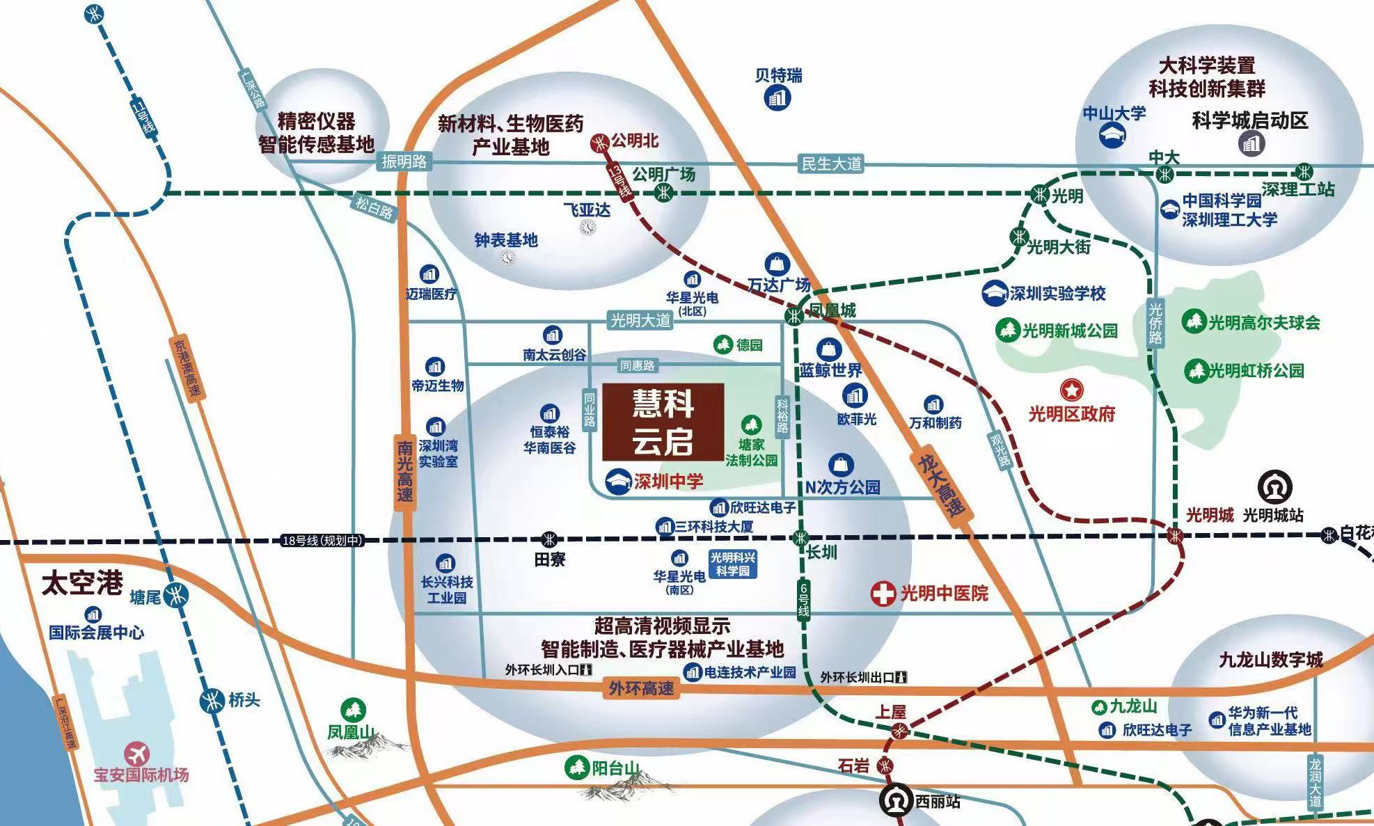 项目区位优势显著,坐拥粤港澳大湾区核心,是广深港科技走廊的重要节点,更是光明科学城——综合性国家科学中心核心承载区的关键产业载体。交通网络四通八达,南光高速、龙大高速、大外环高速纵横交错,光明城高铁站及地铁6号线、13号线环伺周边。周边有深圳中学光明科学城校区、有氧公园等配套设施,聚集华星光电、欧菲光、欣旺达、迈瑞等龙头企业,产业集群效应显著,将与项目形成强大产业协同,加速光明区“基础研究+技术攻关+成果产业化”创新链条闭环,为入驻企业提供丰富的产业资源与协作空间。形成“产城融合、宜居宜业”的优质生态。