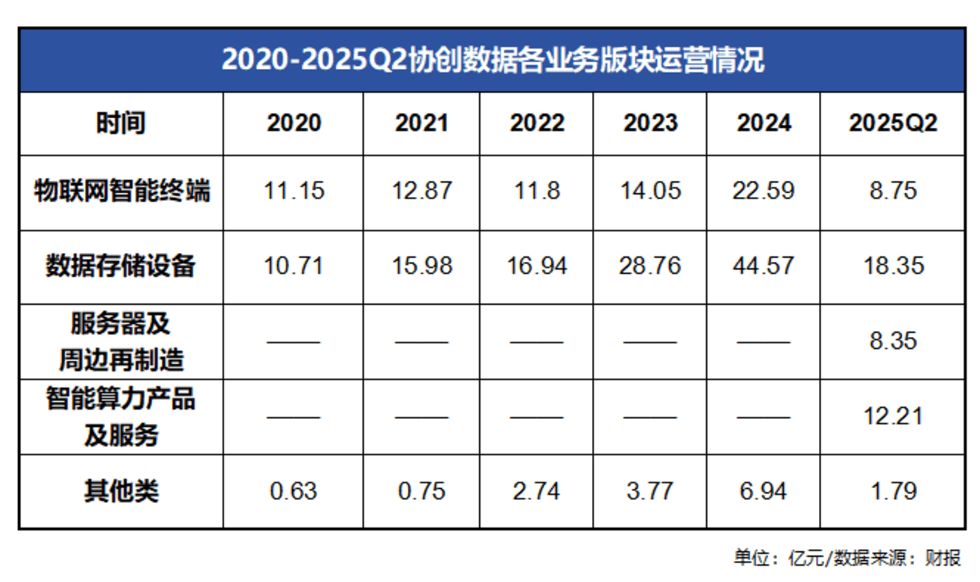 经过此番操作,协创数据有了明显的改变:汇总自2020年以来的年报,物联网智能终端、数据存储设备、其他的三大板块,共同构成了协创数据的业务体系;不过在2025年半年报中,服务器及周边再制造、智能算力产品及服务的两大板块运营情况,开始体现在报表中。