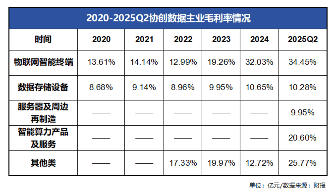 回顾之前提到的数据,智能算力产品及服务板块以24.7%的营收占比,成为协创数据业务的“第二增长曲线”。不过查看财报,截至2025年上半年,20.6%的毛利率低于物联网智能终端(34.45%)及其他(25.77%)两大板块。