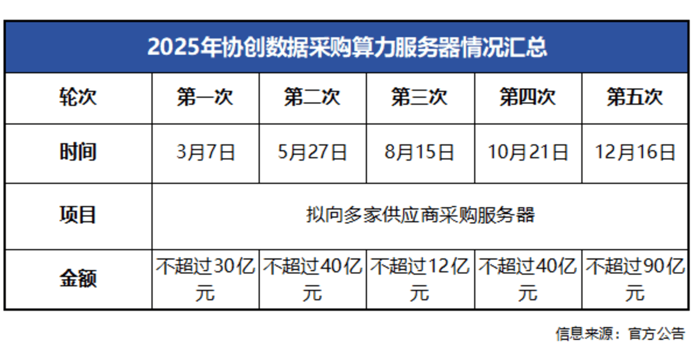 自当年3月初开始,协创数据启动对外采购服务器的安排。采购共分为五个轮次,覆盖年初到年末,金额从最少不超过12亿元,到最多不超过90亿元不等,总计不超过212亿元。采购涉及多家供应商,官方未透露供应商具体名单。