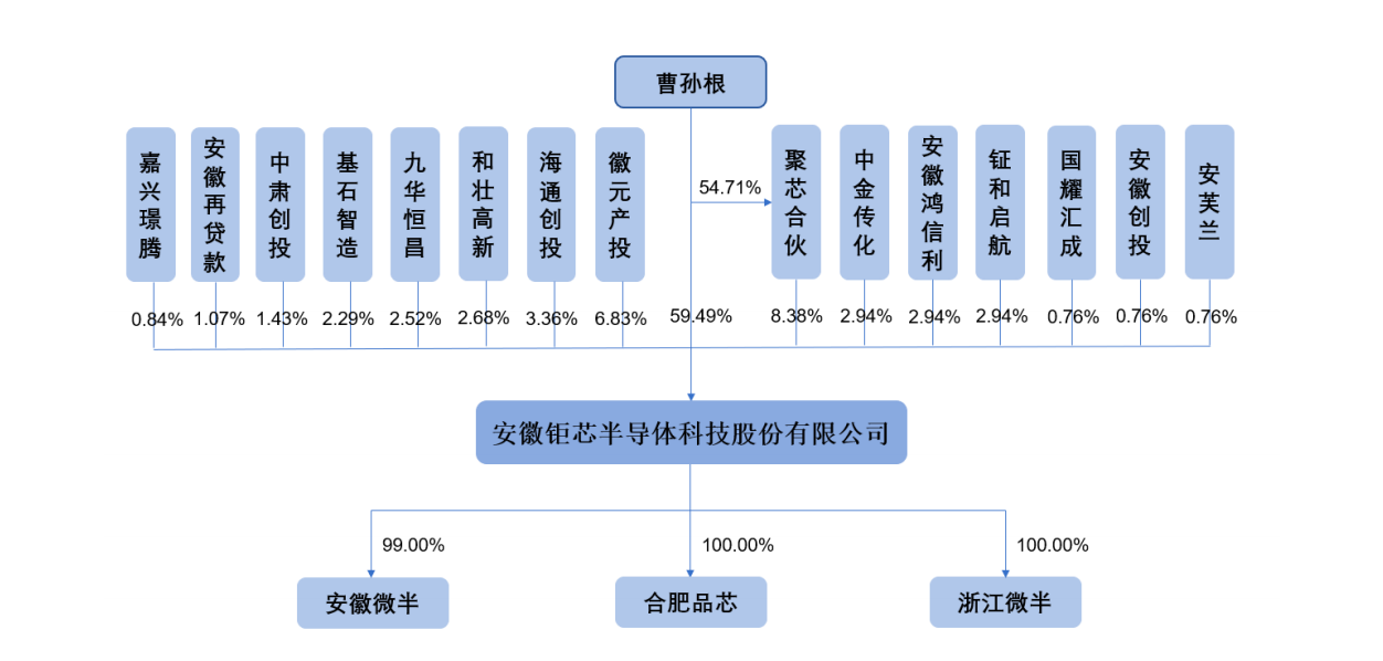 凤凰网财经《IPO观察哨》梳理发现,钜芯科技实际控制人曹孙根直接持股59.49%,通过聚芯合伙间接控制8.38%表决权,合计控制公司67.87%的表决权,处于绝对控股地位;国有股东合计持股6.95%。